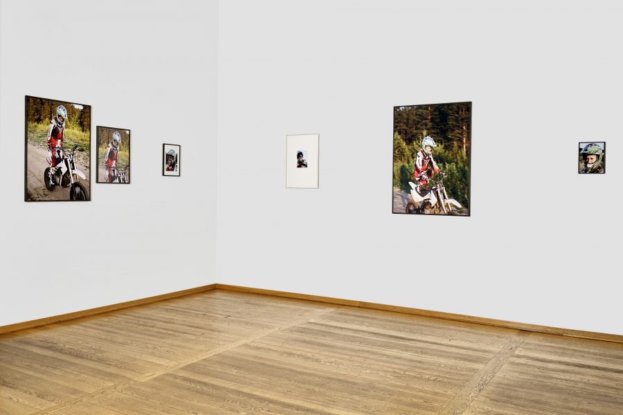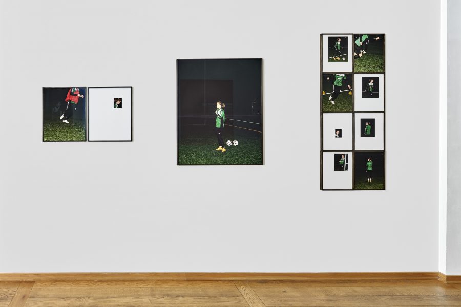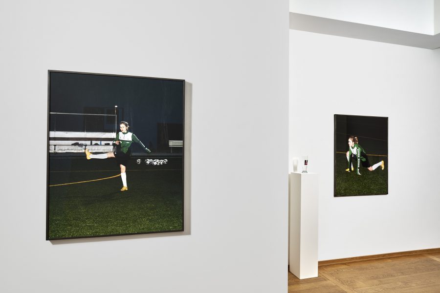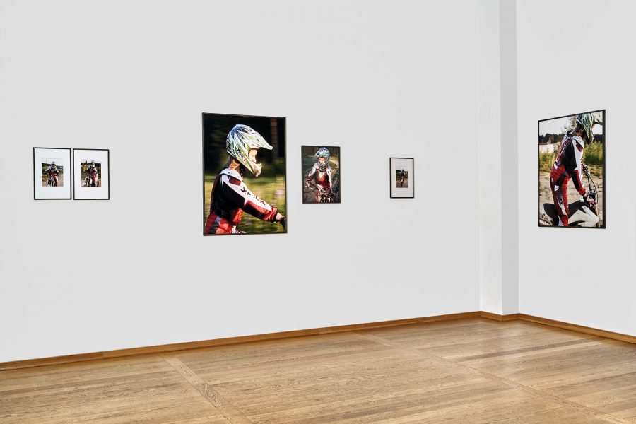 Die Frauen sind bei sich. Das fällt als Erstes auf. Lara ist ganz bei sich, so wie Sasha, so wie Lilli. Die eine aus sportlichem Ehrgeiz, aufmerksam hält sie beim Fußballtraining mit ihren Blicken, ihrem Körper, ihrer Stimme das unsichtbare Netz aufrecht, das sich aus dem Miteinander mit ihren Teamkolleginnen auf dem Feld ergibt. Die andere, Sasha, aus Vorsicht, jede Ablenkung, jede Irritation könnte für sie auf dem Rücken ihrer Motocross-Maschine lebensgefährlich werden. Die dritte, Lilli, aus Lust an sich selbst und der eigenen Darstellung. Aber ist man überhaupt für sich? Wenn man spielt, mit anderen? Wenn man ein Rennen fährt, vor Publikum, auch um zu gewinnen? Wenn man für die Kamera einer anderen Frau posiert, auch wenn sie eine Freundin ist? Kann der Mensch je für sich sein, wenn er sich mit anderen zusammen oder vor anderen etwas tut? Und ist das für Menschen, die sich als Frauen identifizieren, möglicherweise sogar noch schwieriger als ohnehin schon? Weil sie von klein auf den patriarchalen Blick spüren, der nicht nur von Männern, sondern auch von Mädchen und Frauen ausgeht und zu selten frei ist von Kritik, Erwartungen, Ansprüchen an die weibliche Geschlechtlichkeit, die mal zu exponiert, mal zu wenig sichtbar ist und manchmal einfach nicht genehm ist. All diese Fragen stellt Hanna Putz nicht nur den Betrachtenden, sondern auch sich selbst, indem sie die drei Porträt-Strecken ‚Lara‘, ‚Sasha‘ und ‚Lilli‘ für ihre Bücher und die Ausstellung ‚Egalpezo’ (eo: Gleichgewicht) miteinander ins Gespräch bringt. Seitdem Putz hinter der Kamera steht, lotet sie immer wieder aufs Neue die Grundhaltung aus, die sie zum Bild der Frau einnimmt. Dazu gehört auch die gesellschaftspolitische Realität, in der Frauen in patriarchal geprägten Gesellschaften wie der deutschen, österreichischen, russischen, amerikanischen, wie in den meisten Gesellschaften auf dieser Welt, auch heute noch leben und lieben, arbeiten, Mütter werden, Sport machen, Siege feiern und sich eben im weitesten Sinne ins Bild setzen. Genauso wie der Gender Pay Gap, der Gender Health Gap, der Gender Care Gap, durchdringt die Benachteiligung von Frauen fast alle Bereiche des Lebens, Arbeitens, Liebens, ja des Seins. Vor diesem Hintergrund wirken Putz’ Porträtierte wie Positive zu einem Negativ, vor dem sich ihr Leben als Frauen auch abspielen kann. Motiv für Motiv nimmt die Fotografin Haltung ein und legt ihren Blick auf das Frausein an sich frei. Frausein, das beweisen Putz’ „zart-harte Heldinnen“, wie sie die von ihr fotografierten Frauen nennt, ist immer noch eine Frage des Gleichgewichthaltens. Die Strecken heißen wie die Frauen, die sie zeigen: Lara, Lilli und Sasha. Wir lernen nur ihre Vornamen kennen, den Teil ihrer Namen also, der sie als Individuen ausweist, losgelöst von ihren Väternamen, die Menschen auch immer in Beziehung setzen zu ihren Vorfahren und damit zur Vergangenheit. Vornamen sind dagegen die reine Gegenwart. Sie sind einer fortdauernden Aktualisierung unterworfen, immer gleich gültig verweisen sie stets auf ein Jetzt. Und so unterschiedlich diese drei ganz gegenwärtigen Frauen auf den ersten Blick sind – die eine Mitglied einer Zweitliga-Fußballmannschaft, oder besser gesagt einer Fußballfrauschaft in Wien, die andere Motocrossfahrerin in Jekaterinburg, die dritte Künstlerin aus Berlin – sie verbindet, dass sie Handelnde sind. Indem sie etwas tun, wofür sie brennen – und sei es für sich selbst – und natürlich durch die Art, in der Hanna Putz sie fotografiert hat. Sie hätte die Fußballerin Lara und die Motorradfahrerin Sasha ja auch aus ihrer Lebenswirklichkeit heraus und zum Beispiel ins Studio holen können. Dann wären sie immer noch die gleichen, Lara und Sasha, dieselben wären sie nicht. Und das ist Putz wichtig: „Seitdem ich fotografiere interessiere ich mich für Modi des Fotografierens, in denen ich nicht störe, die weniger invasiv sind“, erzählt sie. Für einige ihrer Bilder aus ihrem Buch Everything Else Is A Lie ist sie den von ihr Fotografierten stundenlang hinterhergelaufen, so auch diesmal in ihren Arbeiten ‚Lara’ und ‚Sasha’. Putz versucht sich während des Fotografierens so weit als möglich unsichtbar zu machen. Aber natürlich bleibt eine Kamera eine Kamera, fühlen Menschen sich beobachtet, kann niemand sich frei machen von der Energie des fremden Blicks und dem daraus resultierenden Austausch mit der fotografierenden Person. Wahrscheinlich kann kein Bild je authentisch sein, weil Authentizität nichts ist, was sich festhalten lässt. Putz weiß natürlich um das Dilemma ihres Mediums, doch statt es als Hindernis zu sehen, sich abhalten zu lassen, nimmt sie die Herausforderung an und lässt die Betrachtenden so einen Blick auf die Maske erhaschen, die laut Friedrich Nietzsche jeder Mensch zu seiner Identität erklärt. Aber diese Masken aufzuziehen, dazu haben Menschen eben weniger Chance, wenn sie dabei sind etwas zu tun, was sie lieben und worin sie besser werden wollen. Wie Fußballspielen oder Motorradfahren. Beides übrigens Tätigkeiten, die traditionell nicht unbedingt als weiblich gelesen werden, obwohl das für Lara und Sasha keine Rolle zu spielen scheint. Sie tun, was sie tun, weil sie gut darin sind. Nicht, um jemandem etwas zu beweisen. Ganz anders verhält es sich mit Lilli. Sie ist ganz auf Putz und ihre Kamera fokussiert, auf ihr doppeltes Gegenüber, das sie herausfordert, mit dem sie spielt, flirtet, tanzt, für das sie sich inszeniert, nackt, entspannt, mit Lackstiefeln, in Torerojacke, im Fitnessraum posed oder einfach inbrünstig lacht. Aber auch Lilli handelt im wahrsten Sinne selbstbewusst, indem sie ganz bewusst ein Bild von sich selbst präsentiert. Bilder von nackten Frauen gibt es seit die Menschheit sich ein Abbild von sich macht. Immer noch hängen in den Kunstmuseen dieser Welt weitaus mehr Bilder nackter Frauen als Bilder, die von Frauen gemalt wurden. Kein Bild einer nack